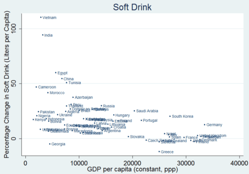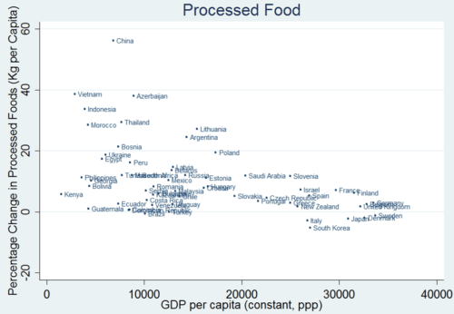 The following two maps reveal contrasting differences increase of soft drinks and processed foods in low-middle-income countries. The maps were taken from David Stuckler et al paper. They have also found evidence that free trade agreements with the US have increased soft drink consumption in the respective countries.