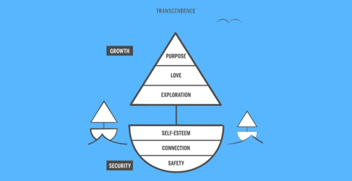 Scott Barry Kaufman introduces a sailboat as an alternative to Maslow’s pyramid. The sailboat consists of two halves, similar to the D-needs (deficiency needs) (security) and B-needs (being needs) (growth). Timothy Lu says it has two shortcomings: One is that it is static similar to the pyramid model; the next is that it also projects the idea that one has to meet one set of needs to move into the next set.