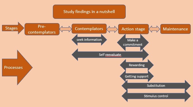 The pre-contemplators were not interested in seeking information in contrast to the contemplators. Making a commitment – for those in the action stage – seemed to be the most highly rated activity. The self-reevaluation became important for both groups who were in the contemplation and action stages. And, those in the action stage valued high being rewarded and getting outside help too. Finally, those in the maintenance stage rated high in coping skills such as substitution and stimulus control but, interestingly, not public support and being rewarded. Both maintenance stage strategies seemed to be useful in the action stage as well.