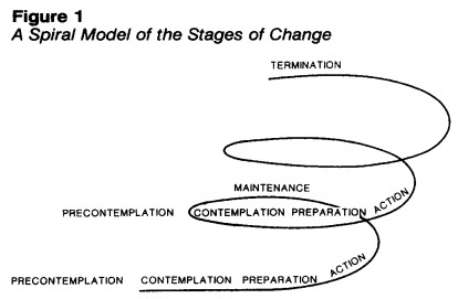 Before 1992, Prochaska and others considered that the shuttling through the stages follows a linear pattern; however, with the emergence of new evidence, they conceptualized the journey through the stages much like a spiral pattern – not linear.