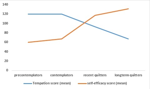This study found that the study participants travelled through different stages of change at different speeds and in different directions. For example, while some contemplators moved forward to the action stage, another group stepped backwards to the pre-contemplative stage – even some stalled at the same stage. I drew the following graph using the mean scores shown in their paper; we can appreciate how temptation and self-efficacy mean scores changed with the stage of change among smokers.