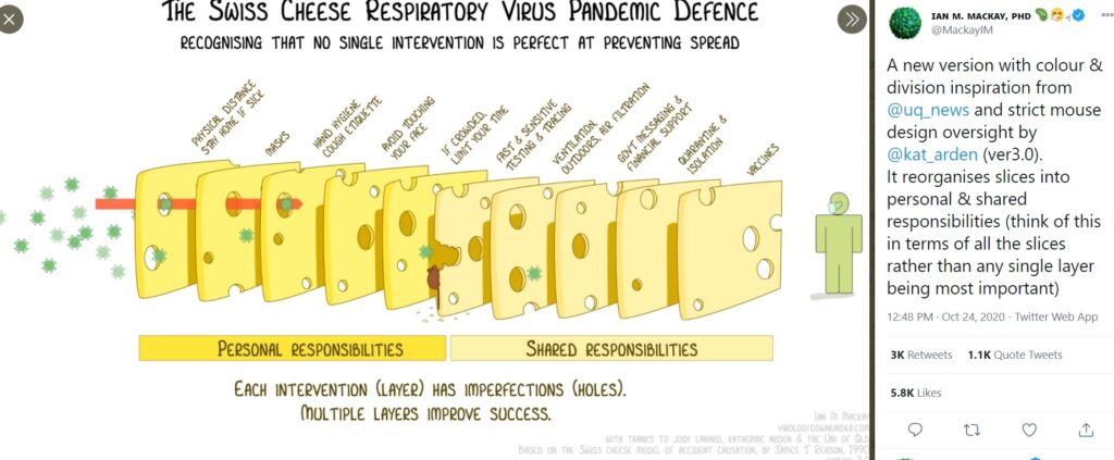 Few Swiss Cheese models for COVID-19 exist. The most popular one is the version of Ian Mackay, a virologist from Brisbane, Australia. The New York Times has reported it after his version went viral on Twitter. The following is his version.
